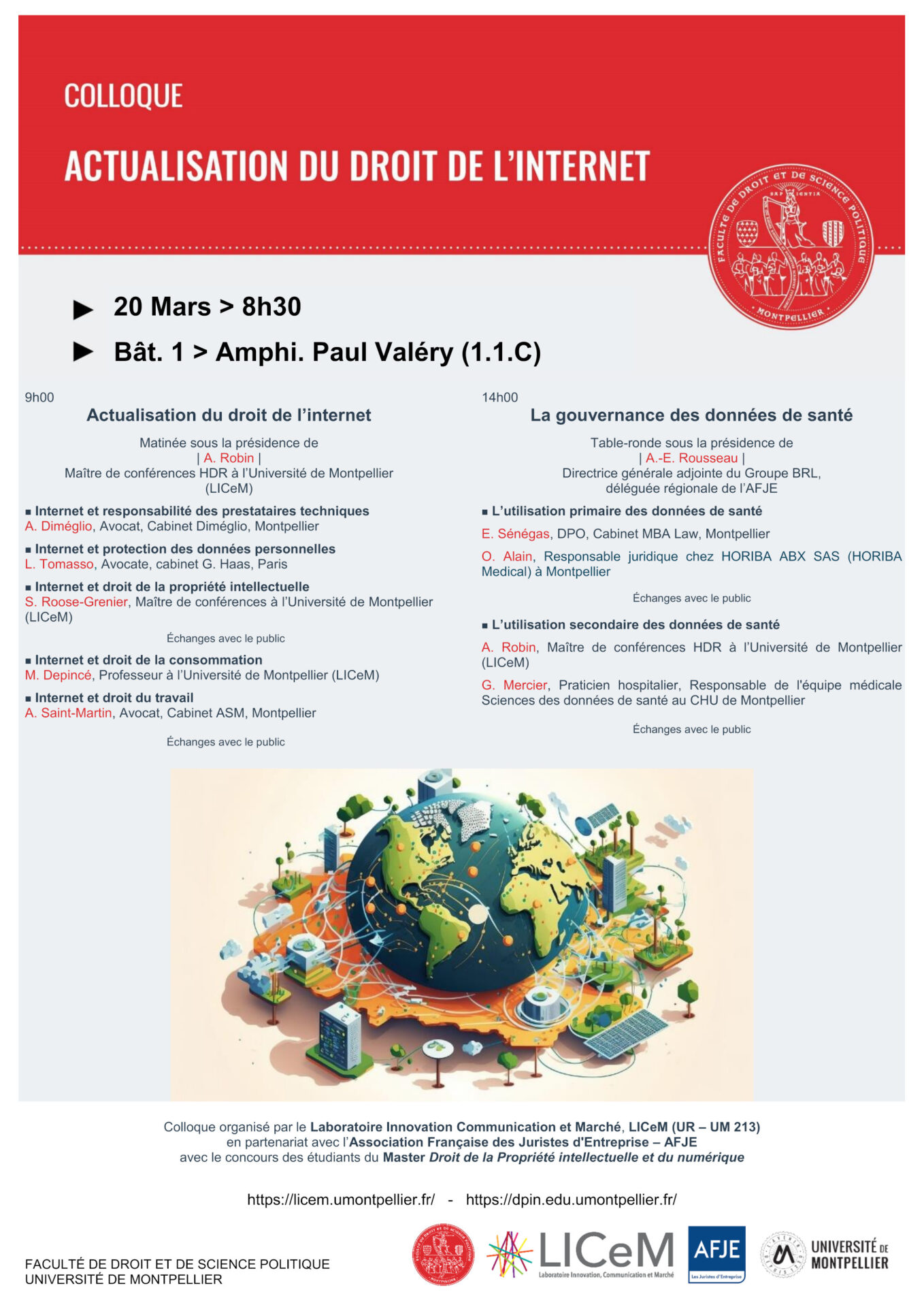 Le Laboratoire Innovation Communication et Marché (LICeM) organise, en partenariat avec l’Association Française des Juristes d’Entreprise (AFJE) la 12ème édition du colloque « Actualisation du droit de l’internet ».