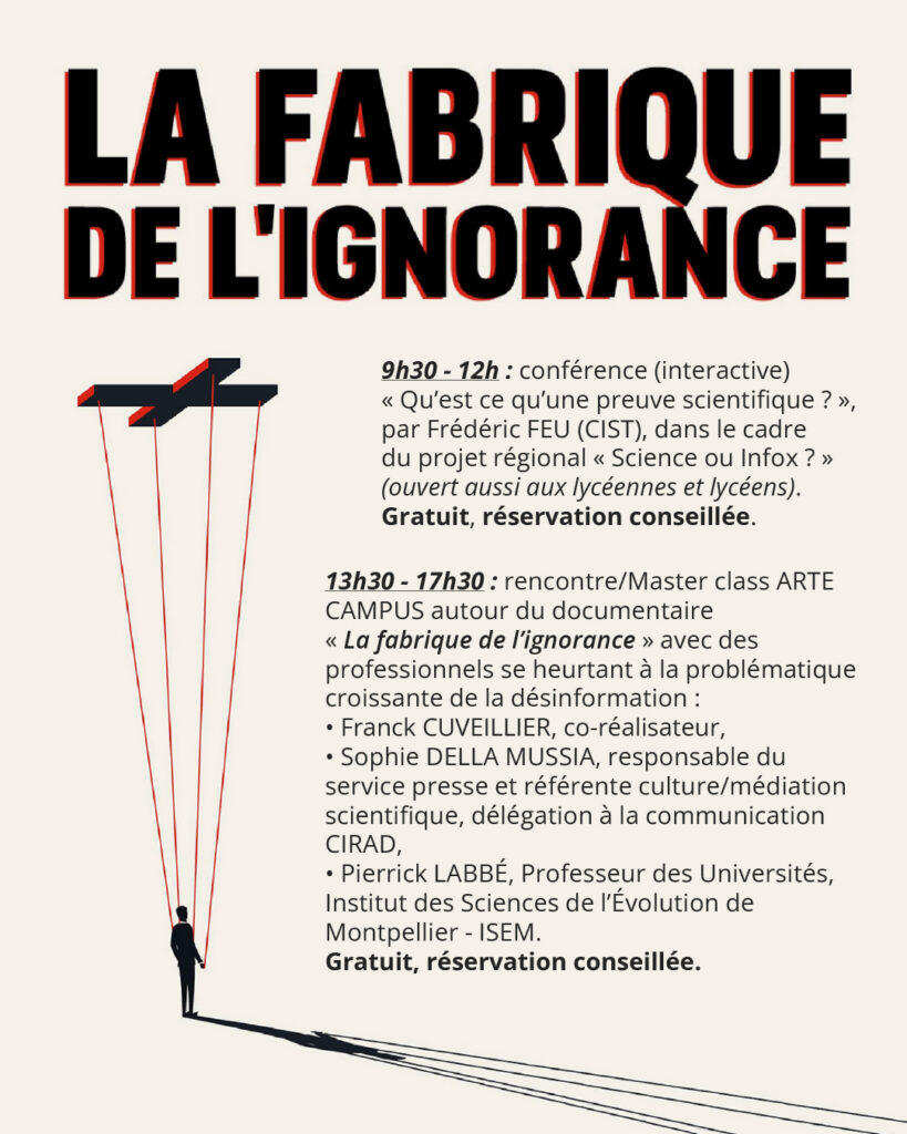 13h30 – 17h30 : Rencontre/Master class ARTE CAMPUS autour du documentaire « La fabrique de l’ignorance » (2021, Franck Cuveillier, Pascal Vasselin) avec des professionnels se heurtant à la problématique croissante de la désinformation dont :