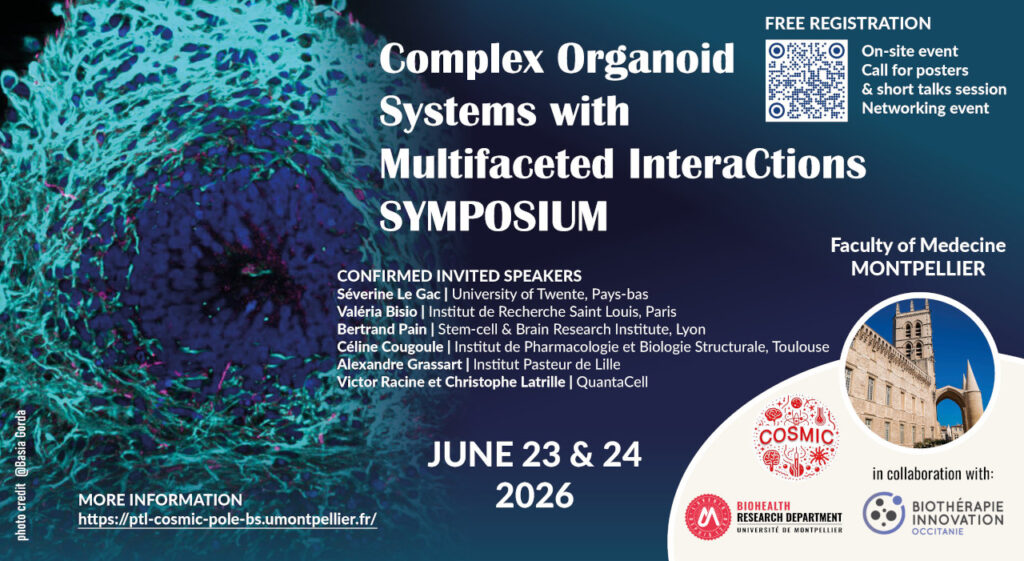 Les inscriptions sont ouvertes pour le 1er symposium du Projet Thématique Long « Complex Organoid Systems with Multifaceted InteraCtions » (PTL COSMIC), en collaboration avec la Filière Biothérapie Innovation Occitanie, qui se tiendra les 23 et 24 juin 2026 à la Faculté de Médecine de Montpellier, sur 1 jour et demi. La date limite de soumission des posters et des flashs talk est fixée au 22 mai 2026.