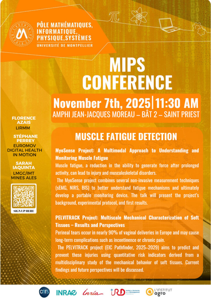 La conférence présentera deux projets de recherche innovants autour de la compréhension et du suivi de la fatigue musculaire ainsi que de la caractérisation mécanique des tissus mous.