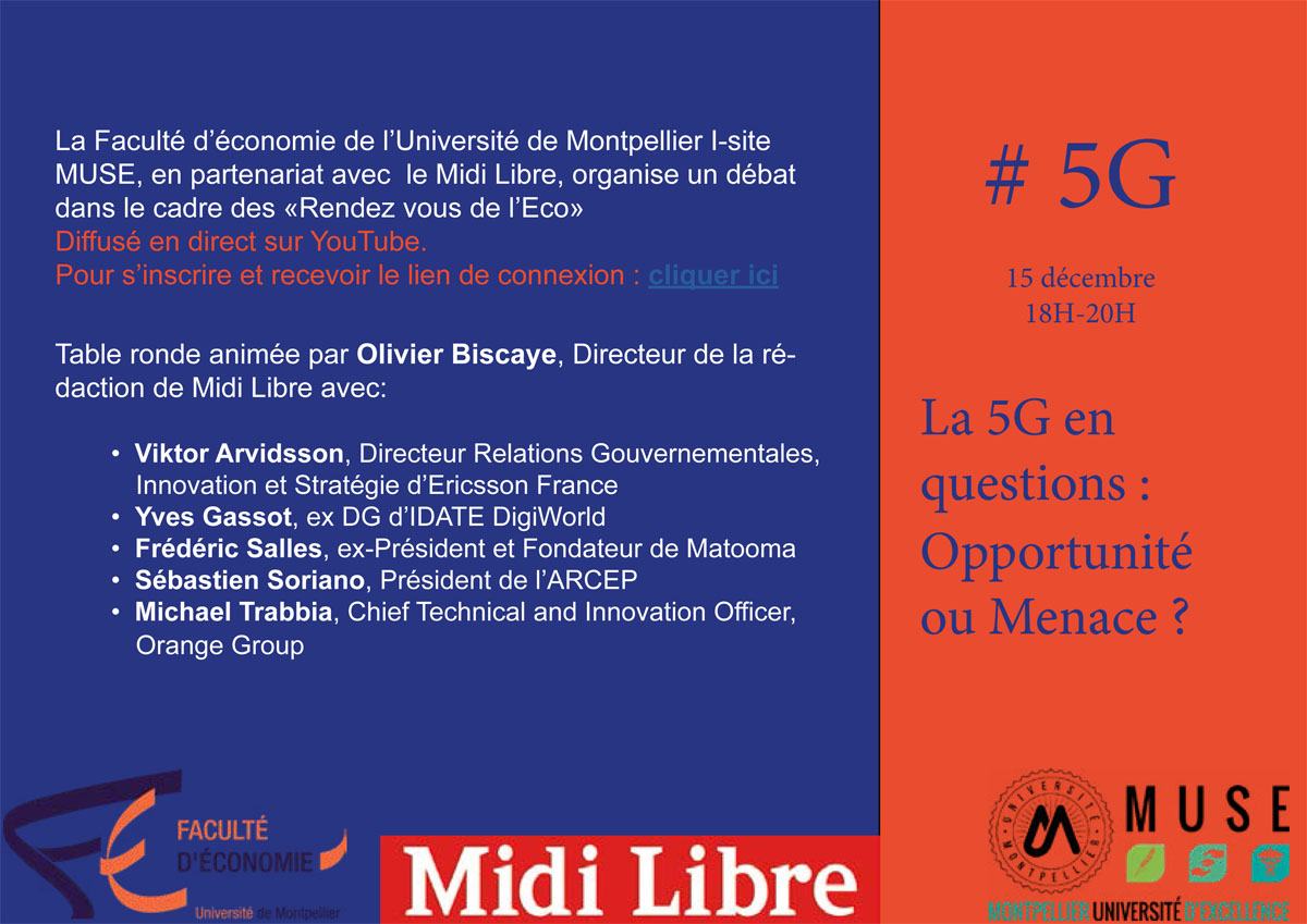 Dans le cadre des « Rendez-vous de l’Eco », la Faculté d’économie de l’Université de Montpellier I-site MUSE, en partenariat avec Midi Libre, organise le 15 décembre 2020 de 18h à 20h un débat sur le thème de la 5G.