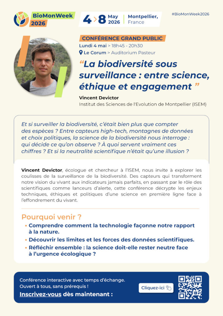 Conférence de Vincent Devictor, écologue et chercheur à l’ISEM, qui nous invite à explorer les coulisses de la surveillance de la biodiversité. Des capteurs qui transforment notre vision du vivant aux indicateurs jamais parfaits, en passant par le rôle des scientifiques comme lanceurs d’alerte, cette conférence décrypte les enjeux techniques, éthiques et politiques d’une science en première ligne face à l’effondrement du vivant.