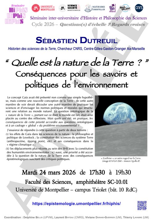 Conférence HiPhiS (Histoire & Philosophie des Sciences) par Sébastien Dutreuil, Historien des sciences de la Terre et de l’environnement, CR CNRS au Centre Gilles-Gaston-Granger (CGGG UMR 7304), Aix-Marseille.