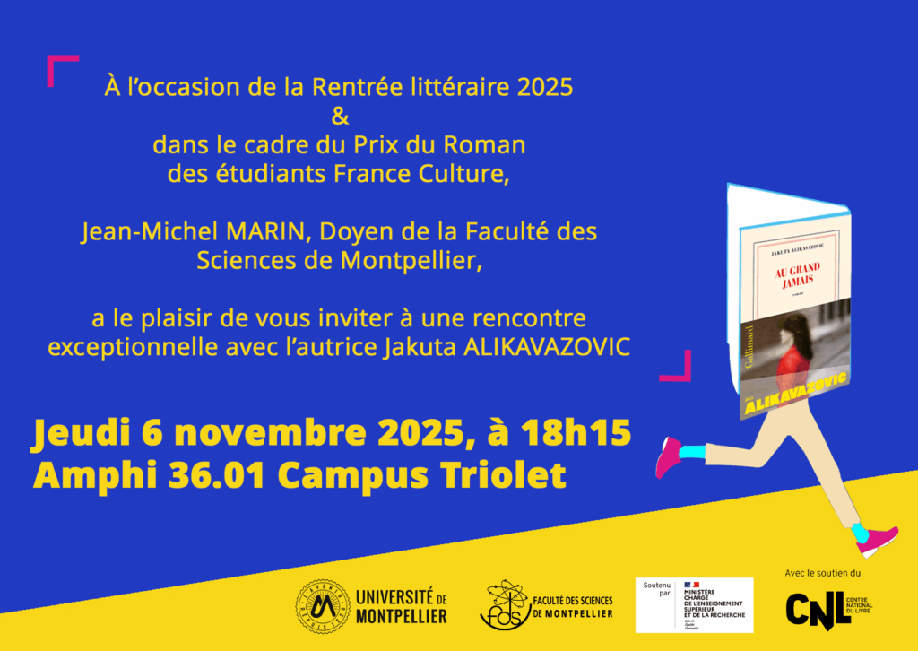 Dans le cadre de la rentrée littéraire 2025 et du Prix du Roman des étudiants France Culture, Jean-Michel MARIN, Doyen de la Faculté des Sciences de Montpellier et Sonia CHALBI, chargée de mission Arts,Culture et Sciences, ont le plaisir d’annoncer la venue exceptionnelle de l’autrice Jakuta ALIKAVAZOVIC pour une rencontre avec les étudiant·es et les personnels, le jeudi 6 novembre 2025 à 18h15 en amphithéâtre 36.01.