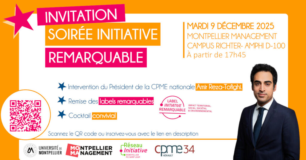 Montpellier Management, le réseau Initiative Montpellier Pic Saint-Loup et la CPME Hérault ont le plaisir de vous convier à la 4ᵉ édition de la Soirée Initiative Remarquable, qui se tiendra le mardi 9 décembre 2025 à partir de 17h45 dans l’amphithéâtre D100 (Bâtiment D) de Montpellier Management, sur le campus Richter à Montpellier.
