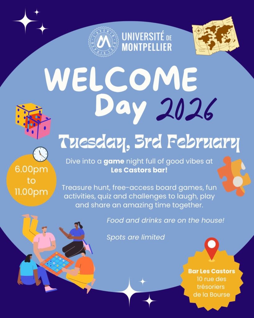 Dans le cadre du programme “Bienvenue en France” et de sa politique d’accueil des nouveaux étudiants, l’Université de Montpellier organise une soirée d’accueil pour les étudiants internationaux rejoignant l’Université au second semestre 2025-2026.