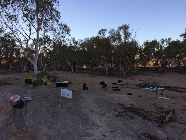 Nous passons donc nos trois premières nuits d’acclimatation au camping de Hale River Homestead à Old Ambalindum (150 km à l’est d’Alice Springs). Après un coup de fil rapide à la fermière le deuxième soir, elle me dit de passer le lendemain à 7h du matin après leur débriefing matinal. Le soleil se lève dans un voile de poussière rouge et sèche, j’aperçois l’hélicoptère des fermiers dont les pales qui tournent brisent le silence matinal glacé. Nous nous garons devant la petite baraque de plain-pied qui accueille la réunion matinale. Nous ne sommes pas conviés à l’intérieur malgré une température de quelques degrés seulement. Nous attendons que la fermière arrive avec des cartes que nous déroulons sur le capot de la voiture. Elle hésite à nous donner l’autorisation d’accès, et nous répétons que nous ne sommes pas une compagnie minière, mais des universitaires, finalement le sésame c’était le nom d’un collègue de l’université d’Adélaïde qui est venu l’année précédente et qui avait fait bonne impression. Ouf la mission est sauvée. Nous partons pour six heures de route, pour entrer dans le dôme d’Entia par une piste praticable et sécurisée avec un seul et unique véhicule. Dernier stop pour remplir le réservoir de diesel avant la fin de la civilisation : la communauté aborigène d’Atitjere, reculée et tellement loin de notre vision occidentale du monde.
