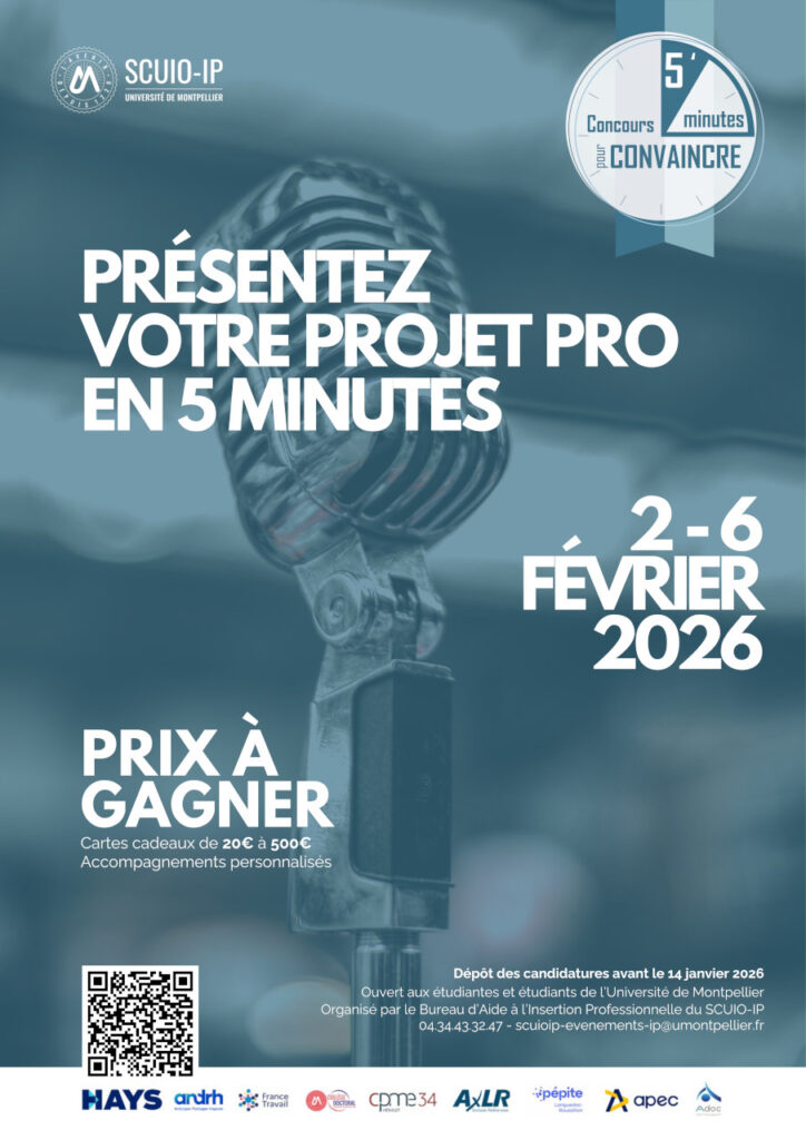 Le Bureau d’Aide à l’Insertion Professionnelle du SCUIO-IP organise le concours « 5 minutes pour convaincre », un évènement unique qui récompense les meilleures présentations de projet. Un jury composé de professionnels du monde socio-économique et de l’enseignement supérieur évaluera vos pitchs.