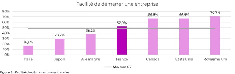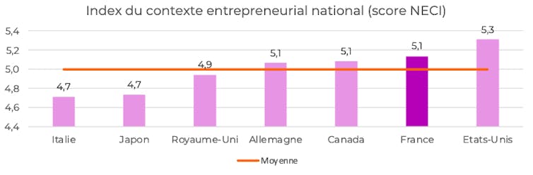 L’étude menée auprès des experts montre notamment que, parmi les pays du G7, il existe une certaine proximité sur la perception de l’écosystème entrepreneurial, qui est vu comme globalement favorable. Seuls les États-Unis (5,3/10) se distinguent légèrement. On peut noter une forte similarité entre des pays comme l’Allemagne, le Canada et la France (5,1/10) pour lesquels les conditions sont perçues globalement comme assez favorables. Ces conditions sont en revanche perçues comme moins favorables pour l’Italie et le Japon (4,7/10).