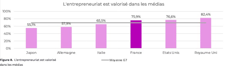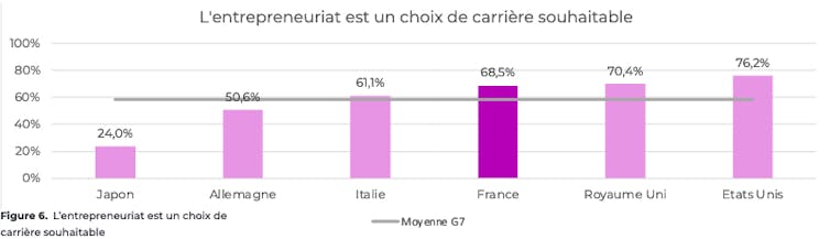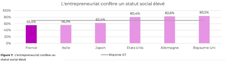 Si l’on compare la France par rapport aux économies du G7, elle se situe là encore dans la moyenne. Pour un peu plus des deux tiers des Français interrogés, l’entrepreneuriat constitue un choix de carrière souhaitable. Pour autant, seule une courte majorité (55,4 %) considère qu’il s’agit aujourd’hui d’un statut social élevé.