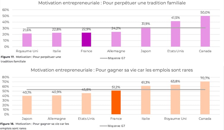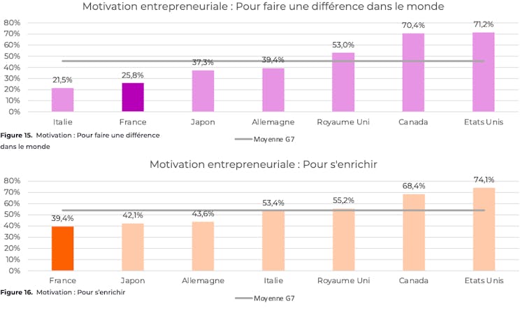 Cependant, selon notre étude, la motivation la plus forte des entrepreneurs est de « gagner sa vie car les emplois sont rares » (51,2 %). Ce résultat laisse à penser qu’une majorité d’entre eux se lance dans l’aventure entrepreneuriale par nécessité. Ce score est plus élevé au Canada (70,7 %), en Italie (61,3 %) ou au Royaume-Uni (63,8 %). Il est en revanche plus en retrait aux États-Unis (45,8 %), en Allemagne (40,9 %) et au Japon (40,1 %).