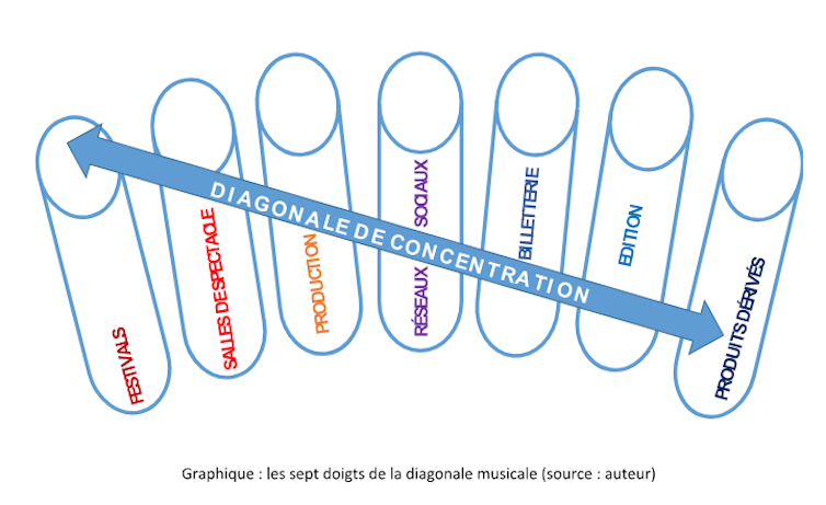On y perçoit des phénomènes de diversification et de concentration. La diversification est caractérisée par l’entrée d’entreprises jadis spécialisées sur un segment (production, gestion de salles, de festivals, label discographique, etc.) dans d’autres segments. Ces entreprises peuvent être essentiellement françaises comme Fimalac, Vente-privée, Morgane, LNEI ; ou multinationales comme Vivendi, AEG ou Live Nation. La concentration se traduit par la prise de contrôle, par un nombre limité d’entreprises, de sociétés jadis interdépendantes, mais relevant de sous-secteurs soumis à une expertise et à des règles propres. La fusion pose donc un enjeu d’articulation de métiers, mais aussi de statuts jusque-là séparés.