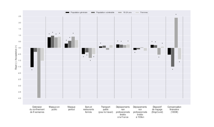 Les masques, les restrictions dans les transports publics et le traçage numérique (via une application optionnelle pour téléphone portable) ont été jugés acceptables par la population en général, à condition que les restrictions sur chacune de ces dimensions restent raisonnables. Ainsi, le port du masque est bien moins accepté lorsque la mention « partout » lui est associée.