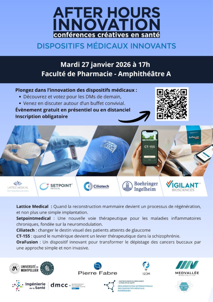 Organized by the DMCC track of the Master's in Health Engineering, the Biotin track of the Master's in Biology and Health, and the RIDMN track of the Master's in Medicines and Health Products, in partnership withthe Institute for Innovation in Medical Devices, the Chair in Innovation and Medical Devices, and Pierre Fabre Oral Care, this event is open to the entire Montpellier University community and its partners: healthcare professionals, researchers, manufacturers, start-ups, support structures, and players in healthcare innovation.