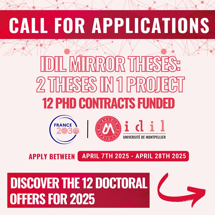 Open since April 8, 2025, the thesis offers of the IDIL Graduate Program of the University of Montpellier give access to 12 doctoral contracts distributed within 6 multidisciplinary research projects. These "mirror projects" combine two distinct disciplinary theses within a single structure, offering a genuine platform for scientific and institutional innovation.