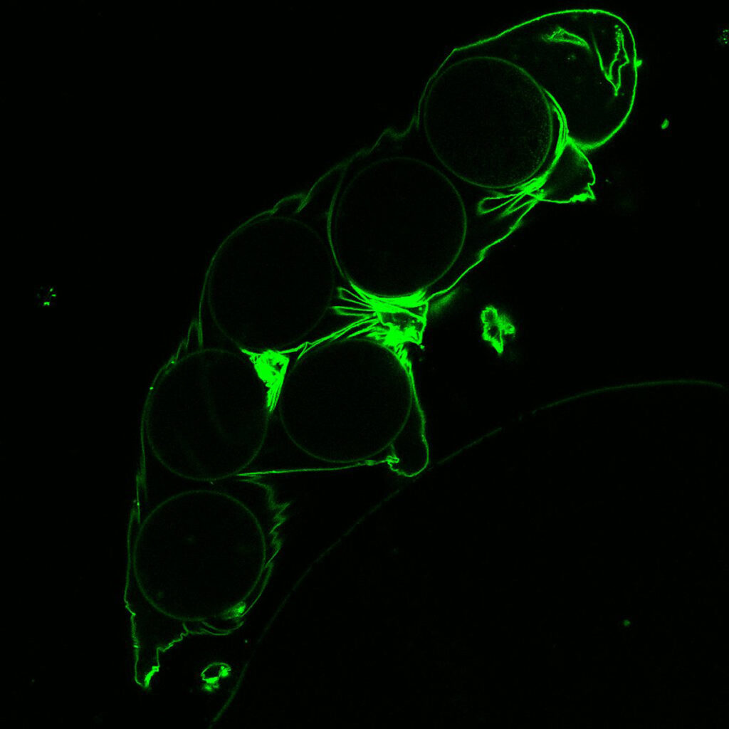 Adult tardigrade "Ramazzottius varierornatus" viewed by scanning electron microscopy. Tardigrades are animals measuring around 1 mm long, with eight legs and, in some species, a pair of ocelli (light-sensitive organs). Present on Earth for almost 500 million years, living in all environments, tardigrades have the highest resistance capacities on the planet. They survive dehydration, extreme pressures and temperatures, and radiation. The GigaTardi project explores the interior of tardigrades using several techniques to reveal their stress resistance strategies. UMR5247 Institut des Biomolécules Max MousseronAdult Tardigrade "Hypsibius exemplaris" viewed ventrally under confocal laser scanning microscopy after treatment with a product that colors its mitochondria (intracellular organelles responsible for respiration) red. Red spheres with patterns inside can be seen. These storage cells move throughout the animal to bring nutrients to other cells (muscles, neurons, digestive tract, etc.). Tardigrades are animals measuring around 1 mm long, with eight legs and, in some species like this one, a pair of ocelli (light-sensitive organs). "Hypsibius exemplaris" is transparent, which makes it possible to visualize internal structures using dyes. Present on Earth for almost 500 million years, living in all environments, tardigrades have the highest resistance capacities on the planet. In particular, they can survive extreme pressures (up to 7.5 GPa) without damaging their internal structures. The GigaTardi project explores the interior of tardigrades using several techniques, to reveal their stress resistance strategies. UMR5247 Institut des Biomolécules Max MousseronTardigrade "Hypsibius exemplaris" seen, ventral side, under confocal laser scanning microscopy after treatment with products that stain muscles green and DNA blue. Tardigrades are animals measuring around 1 mm in length, with eight legs and, in some species like this one, a pair of ocelli (light-sensitive organs). "Hypsibius exemplaris" is transparent, which makes it possible to visualize internal structures using dyes. Tardigrades have muscles, neurons, an intestine and a microbiome. Present on Earth for almost 500 million years, living in all environments, tardigrades have the highest resistance capacities on the planet. In particular, they can survive extreme pressures (up to 7.5 GPa) without damaging their internal structures. The GigaTardi project explores the interior of tardigrades using several techniques, to reveal their stress resistance strategies. UMR5247 Institut des Biomolécules Max MousseronTardigrade "Hypsibius exemplaris" seen under confocal laser scanning microscopy (side view). Tardigrades are animals about 1 mm long, with eight legs and, in some species like this one, a pair of ocelli (light-sensitive organs). This species carries out two operations at the same time: laying eggs and moulting (changing skin). In this image, obtained with a special filter, we can see six embryos laid and abandoned in the moult (old skin) by the adult. Present on Earth for almost 500 million years, living in all environments, tardigrades have the highest resistance capacities on the planet. They survive dehydration, extreme pressures and temperatures, and radiation. The GigaTardi project explores the interior of tardigrades using several techniques to reveal their stress resistance strategies. UMR5247 Institut des Biomolécules Max MousseronA tardigrade "Hypsibius exemplaris" molting embryos, as seen by confocal laser scanning microscopy (side view). Tardigrades are animals about 1 mm long, with eight legs and, in some species like this one, a pair of ocelli (light-sensitive organs). This species carries out two operations at the same time: laying eggs and moulting (changing skin). In the image, six embryos have been laid and abandoned in the molt (old skin) by the adult. We can also see the tips of the adult's legs, capped by the species' characteristic claws. Present on Earth for almost 500 million years, living in all environments, tardigrades possess the planet's highest resistance capacities. They survive dehydration, extreme pressures and temperatures, and radiation. The GigaTardi project explores the interior of tardigrades using several techniques to reveal their stress resistance strategies. UMR5247 Institut des Biomolécules Max MousseronTardigrade "Hypsibius exemplaris", ventral side, and its embryos seen under confocal laser microscopy. Tardigrades are animals about 1 mm long, with eight legs and, in some species like this one, a pair of ocelli (light-sensitive organs). This species carries out two operations at the same time: laying eggs and moulting (changing skin). In the picture, four already laid embryos are still cohabiting in the same skin with the adult. In a few minutes, the adult will extract itself from the moult and leave them behind. We can also make out the adult's eye-spots and a few claws at the end of its legs. Present on Earth for almost 500 million years, living in all environments, tardigrades possess the planet's highest resistance capacities. They survive dehydration, extreme pressures and temperatures, and radiation. The GigaTardi project explores the interior of tardigrades using several techniques to reveal their stress resistance strategies. UMR5247 Institut des Biomolécules Max Mousseron