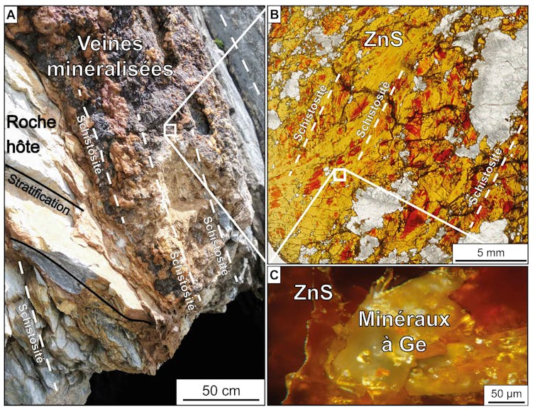 Our study shows that rare metals such as germanium, gallium and indium can exist in minute quantities, disseminated in base metal crystals, but also in small, hyperconcentrated carrier minerals. We have demonstrated that the deformation of zinc sulfide ore, contemporaneous with the formation of mountain ranges, favors the re-concentration of germanium in hyper-concentrated minerals (our chocolate chips) at the heart of mountain ranges, in this case the Pyrenees.
