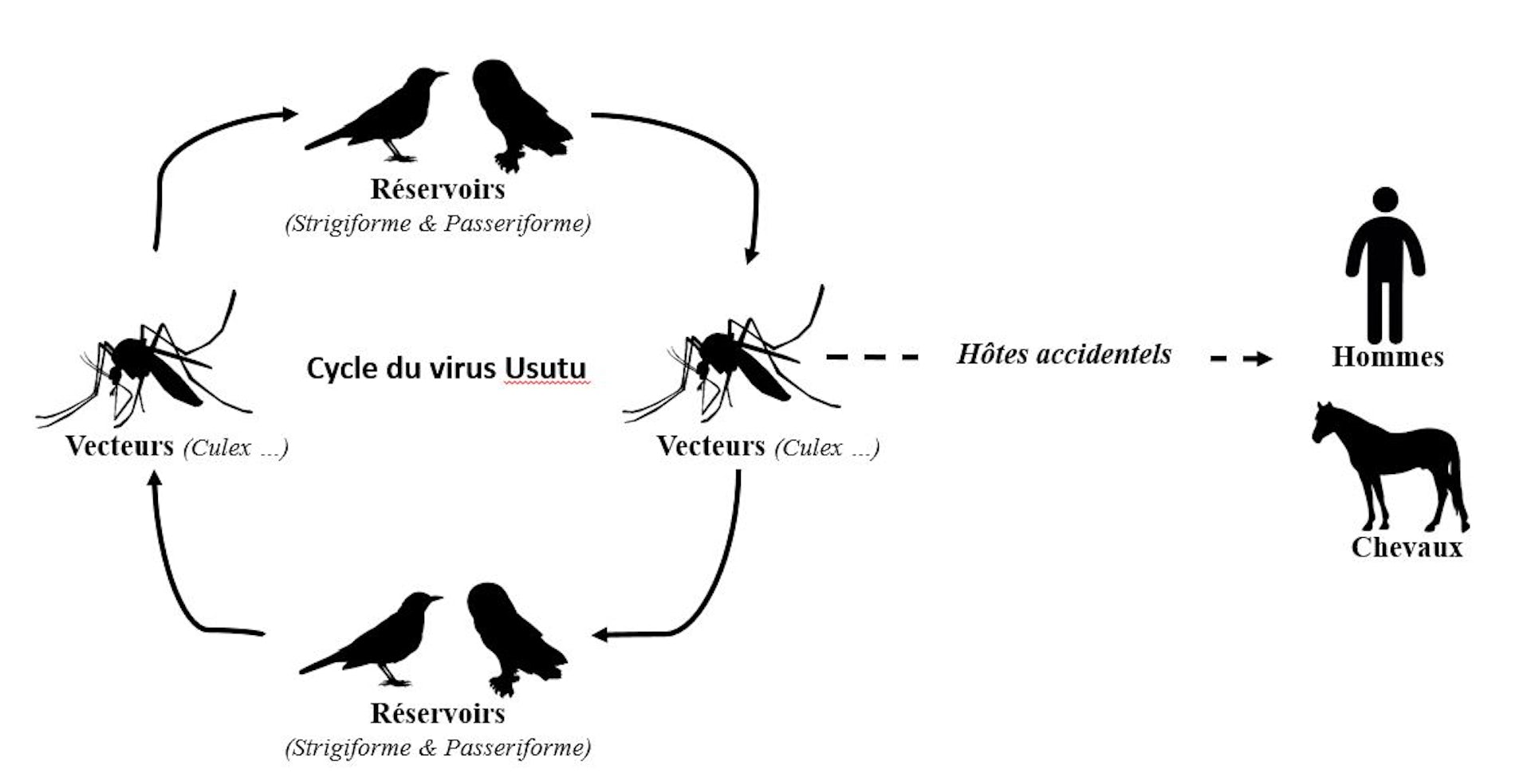 Various studies have demonstrated the involvement of several mosquito species in the maintenance of the Usutu cycle in avifauna, i.e. birds occupying the same area. The virus was isolated from Aedes albopictus (better known as the tiger mosquito), Aedes caspiuis, Anopheles maculipennis, Culex quinquefasciatus, Culex perexiguus, Culex perfuscus, Coquillettidia aurites, Mansonia Africana and Culex pipiens. All these species are ornithophiles, but also bite humans.