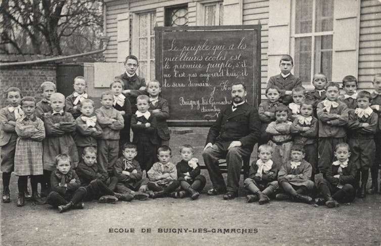 It shows a teacher at the center of his classroom, and a blackboard on which is written the quotation from the minister Jules Simon: "the people who have the best schools are the first people. If they are not today, they will be tomorrow", an explicit quotation of this desire for revenge after the defeat of the Franco-Prussian war of 1870-1871.