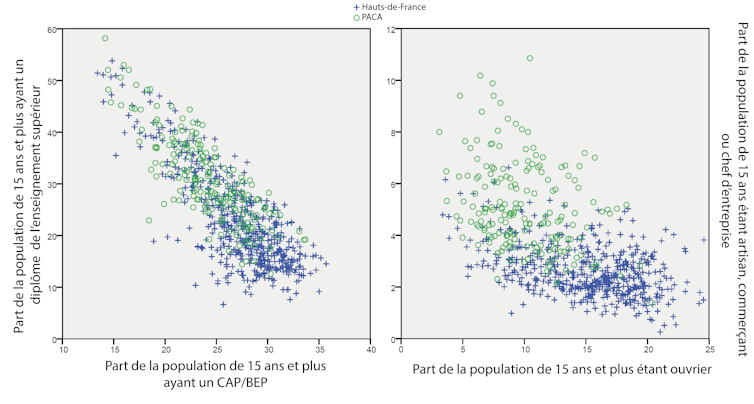 Similarly, communes in Hauts-de-France where the RN vote is high have a higher proportion of inhabitants with a CAP/BEP qualification than in PACA, where the overall level of education is higher (Chart 1, left). These differences describe distinct regional sociological realities, but also indirectly distinct electorates, as underlined by the interviews conducted as part of my thesis work in each of these areas.