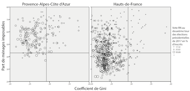 Communes with a high RN vote are not only sociologically distinct, but also "economically" distinct. In the PACA region, the RN vote comes from communes where the proportion of taxpaying households is higher than the national average, while in the Hauts-de-France region, poorer communes are more likely to vote RN than wealthier ones.